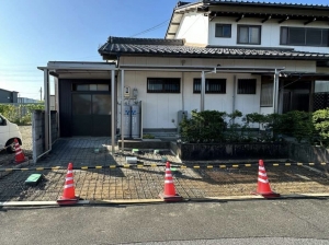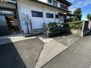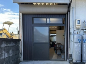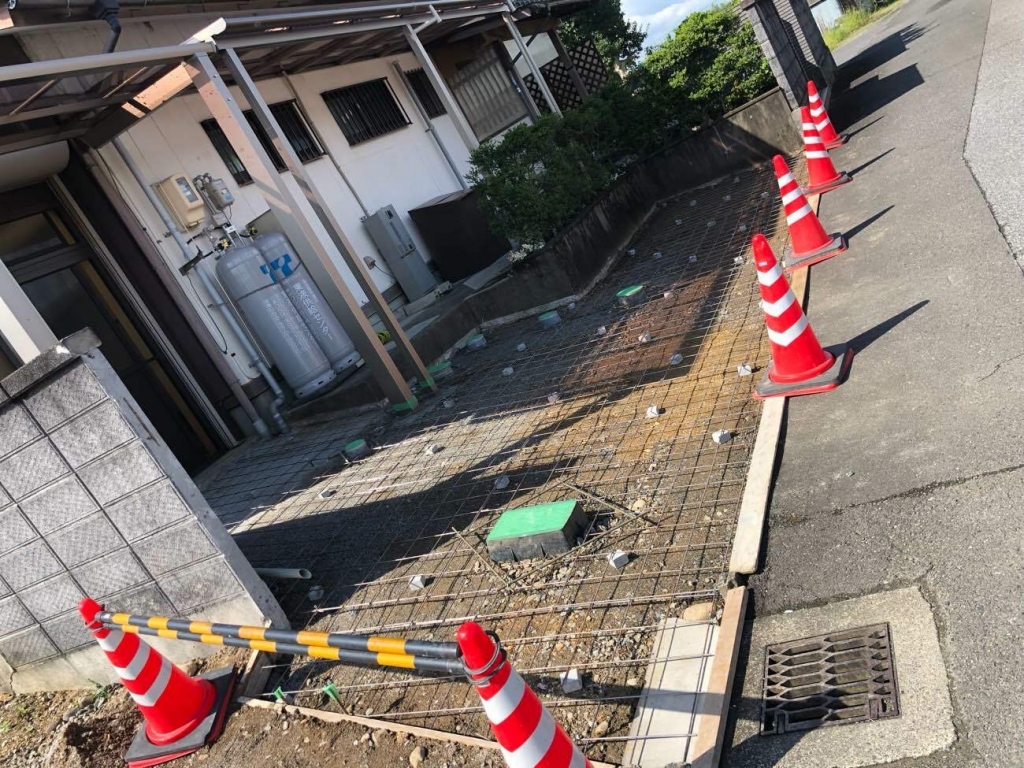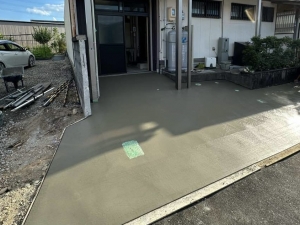 経年劣化でクラックが入ってしまっている駐車場の土間コンクリートの打ち替えと倉庫の扉をお取り替えしました。