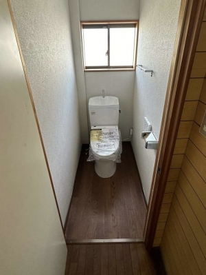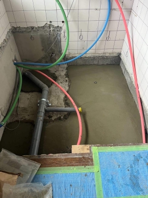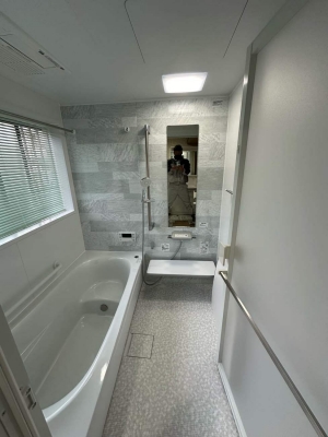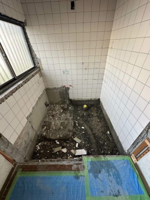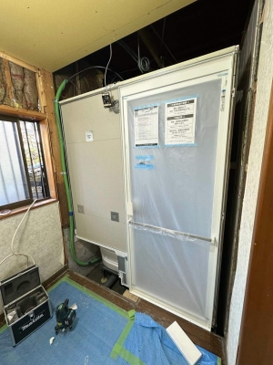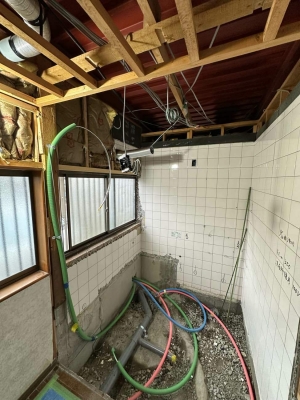 在来工法のお風呂からユニットバスに、洋式トイレの取替工事を行いました。 浴室下で漏水がありました。新規で配管を引き直しご安心して頂くことができました。