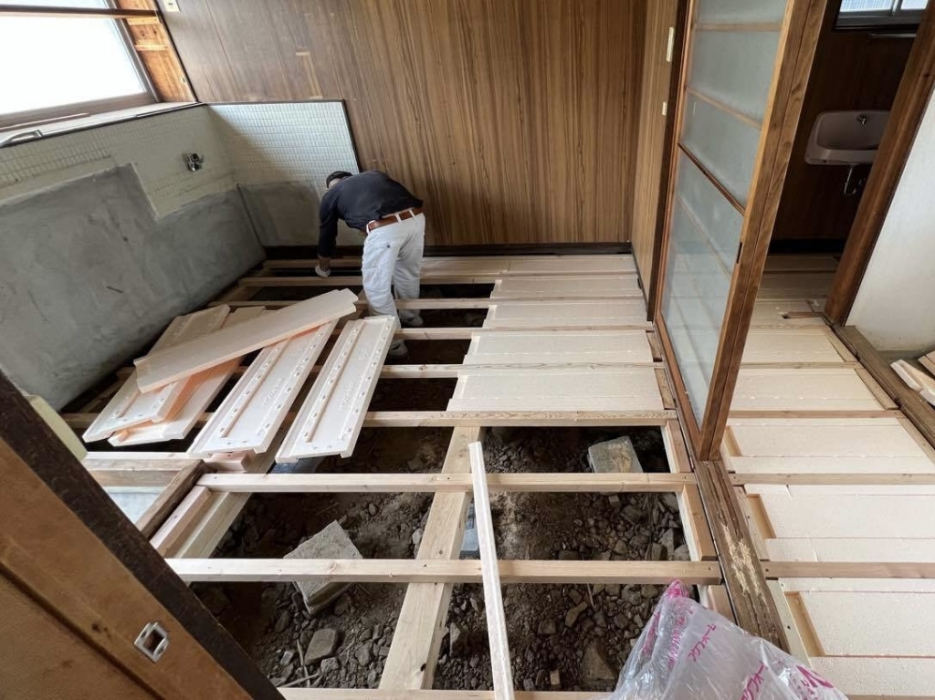 経年劣化により床がふわふわしていたため、床材をすべて剥がし、床組みからしっかりとやり直しました。