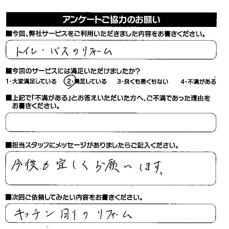 天草市本渡町の方よりいただきました。 お風呂、トイレのリフォームをご依頼いただきました。 その後、何か不具合はございませんか? 困った事がありましたら、いつでも気軽にお問合せ下さいね。 ありがとうございました。