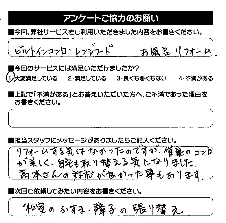 天草市亀場町の方よりいただきました。 いつも営業の髙本がお世話になっております。 今回は、ビルトインコンロ・レンジフード・お風呂のリフォームをさせていただきました。 ご満足いただいたようで良かったです。 また何かございましたら、いつでもお声掛け下さい。 ありがとうございました。