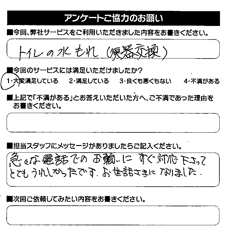 天草市亀川町の方よりいただきました。 トイレの不具合でご連絡また、お取替えありがとうございます。 ご家庭で、困った事がございましたら、いつでも天草エネルギーへ ご連絡下さい。アマエネジャーが駆けつけます。 ありがとうございました。