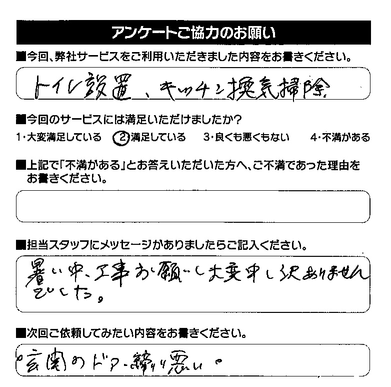 今回は、トイレのお取替えと、キッチン換気扇の掃除をご依頼いただきました。