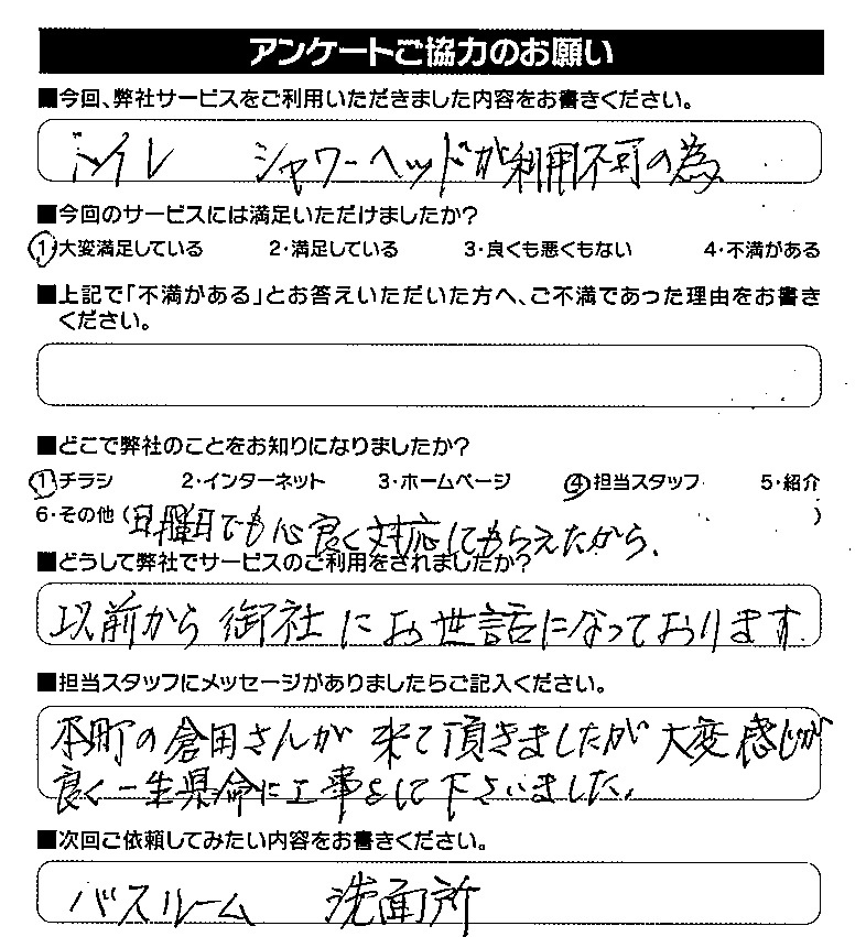いつも営業の倉田、配送担当の岩﨑がお世話になっております。 この度はトイレのウォシュレット交換をご依頼いただき、 誠にありがとうございました。 以前から継続してご利用いただけていること、心より感謝申し上げます。 倉田の対応にも温かいお言葉をいただき、大変励みになります。 次回のバスルームや洗面所のご相談も、ぜひお気軽にお声がけください。 ありがとうございました。