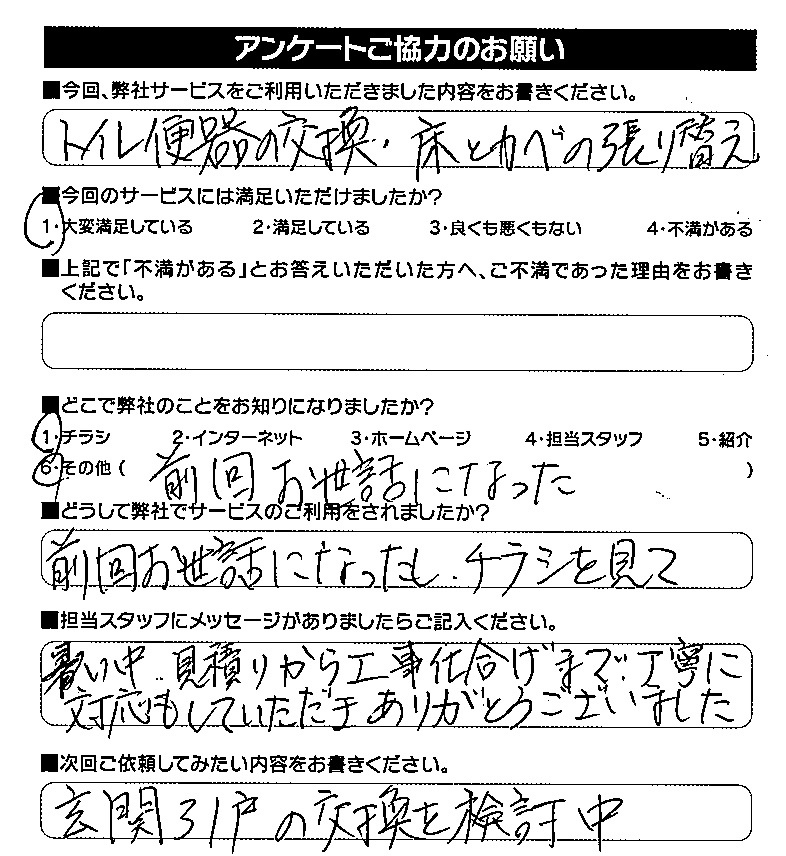 いつも渡邊がお世話になっております。 この度はトイレのリフォームをご依頼いただき、 誠にありがとうございました。 今回の対応にご満足いただけたとのこと、大変嬉しく思っております。 玄関引き戸のご相談も、ぜひお気軽にお声がけください。
