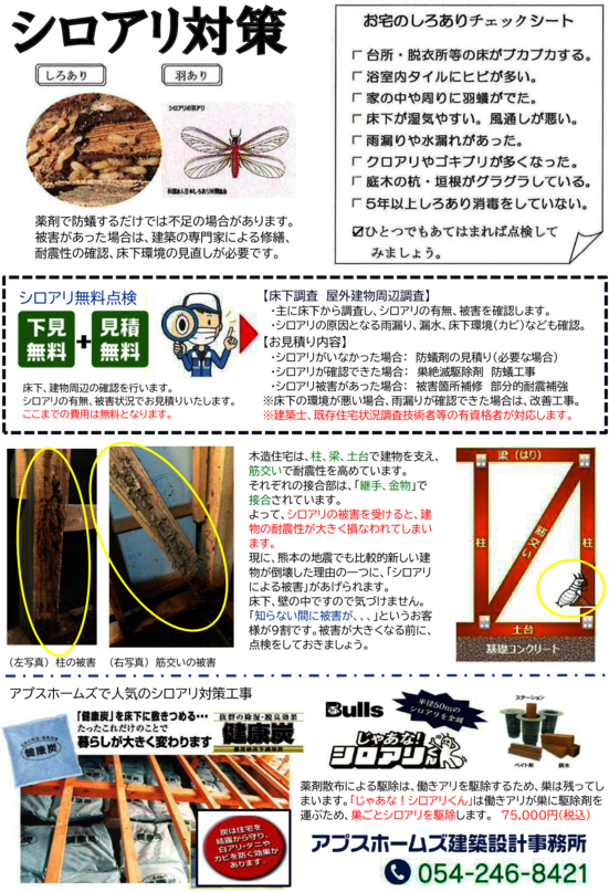 シロアリの被害は、土台、柱、筋交いなど、木造住宅にとって耐震上重要な構造部分に及ぶ場合がございます。