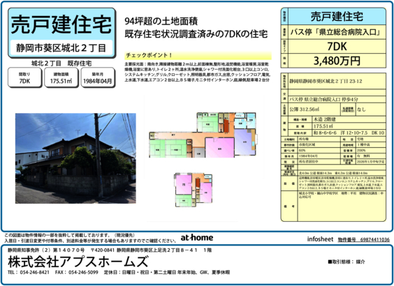 3,480万円に値下げしました。 バイパス沿いにある城北2丁目の中古住宅です。 94.54坪の土地に延床175.51㎡で7DKと広々としたお住まいです。 築41年ですが、適時リフォーム歴があり、弊社でもリフォームプランをご用意しております。 内覧も可能ですので、ご希望の方はお気軽にお問い合わせください。 054-246-8421 担当:青木