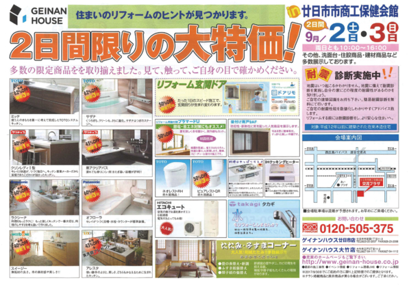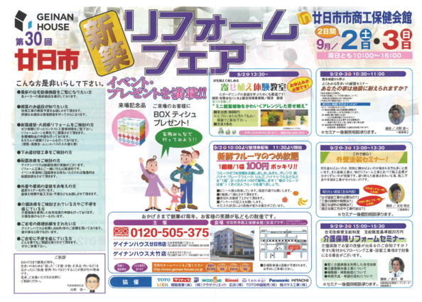 9/2(土曜)3(日曜)で廿日市のイベントを行います!!今回は廿日市市の商工保健会館で行います。 大好評の寄せ植え体験教室や、フルーツ詰め放題があります。 耐震セミナーや外壁塗装セミナーにもどうぞお気軽にお越しくださいませ!