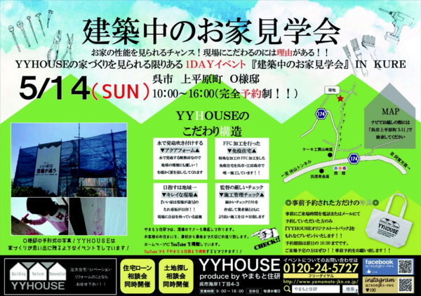 お家の性能を見られるチャンス!現場にこだわるのには理由がある!! YYHOUSEの家造りが見られる限りある1dayイベント 『建築中のお家見学会』是非お越しください。 見学会は完全予約制となっております。 フリーダイアル:0120-24-5727 にてご予約お待ちしております。