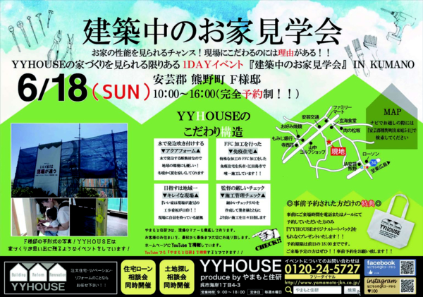 YYHOUSEの家づくりを見られる限りある1dayイベント 『建築中のお家見学会』 YYHOUSEの今しか見る事の出来ない こだわりの構造を是非見に来てください。 *事前予約特典* 6月17日 18時までにご見学の予約をして頂いた方には YYHOUSEオリジナルトートバッグをプレゼント! 見学のご予約はこちらから。 フリーダイアル 0120-24-5727