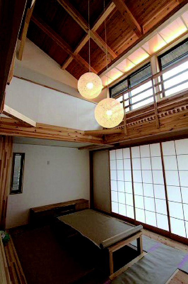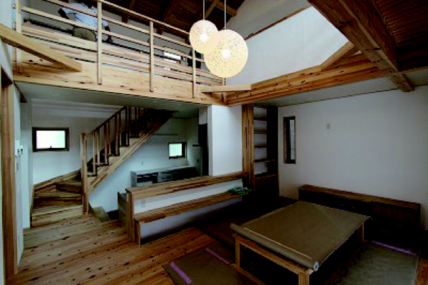 和の趣あふれる大空間のお家です。 勾配天井のリビングと二階を融合させた 開放的な間取りとなっています。 室内は節のある桧板を床材に、壁は無添加漆喰。 空気感がなんとも心地いい空間です。 リビングには足をゆったり伸ばせる掘りごたつ式のテーブルを造りました。