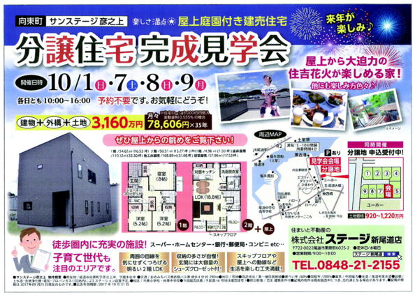 尾道市向東町のサンステージ彦之上にて屋上庭園付き建売住宅の完成見学会を開催させていただきます。屋上から見える尾道の景色を是非ご覧になって下さい ご予約は不要です。