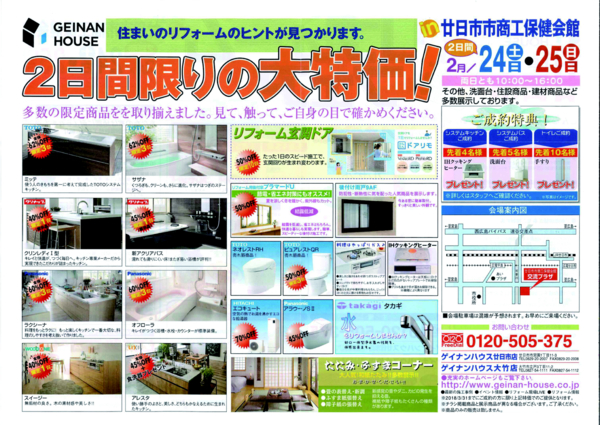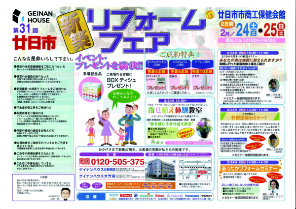 新築・リフォームフェアを開催致します。 耐震セミナーや外壁塗装セミナー。 いつも大人気の寄せ植え教室も有ります。 特価品も多数ご用意しています。 是非お越しください。 お問い合わせは 株式会社ゲイナンハウス 0120-505-375