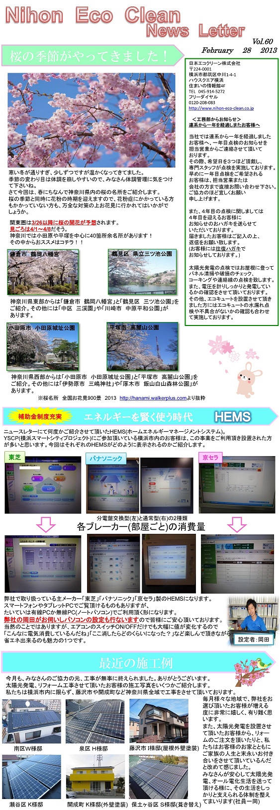 ニュースレター2月号を更新いたしました! (1ページ目) ・「桜の季節がやってきました!」 皆さまは今年、お花見はされますか? 早くキレイに咲く桜がみたいですね! (2ページ目) ・「エネルギーを賢く使う時代」 横浜市の企画(YSCP)をキッカケに弊社でもHEMSを取り扱うようになりました。 今では横浜市のみならず他県でも導入が増えています! ・「最近の施工例」