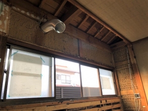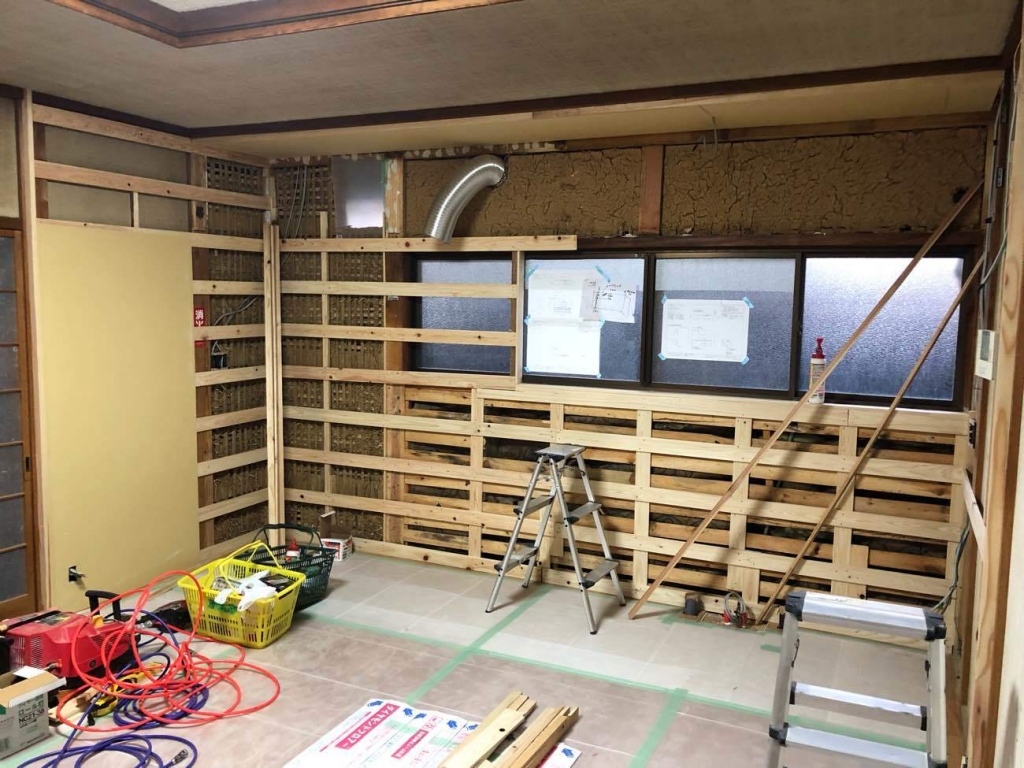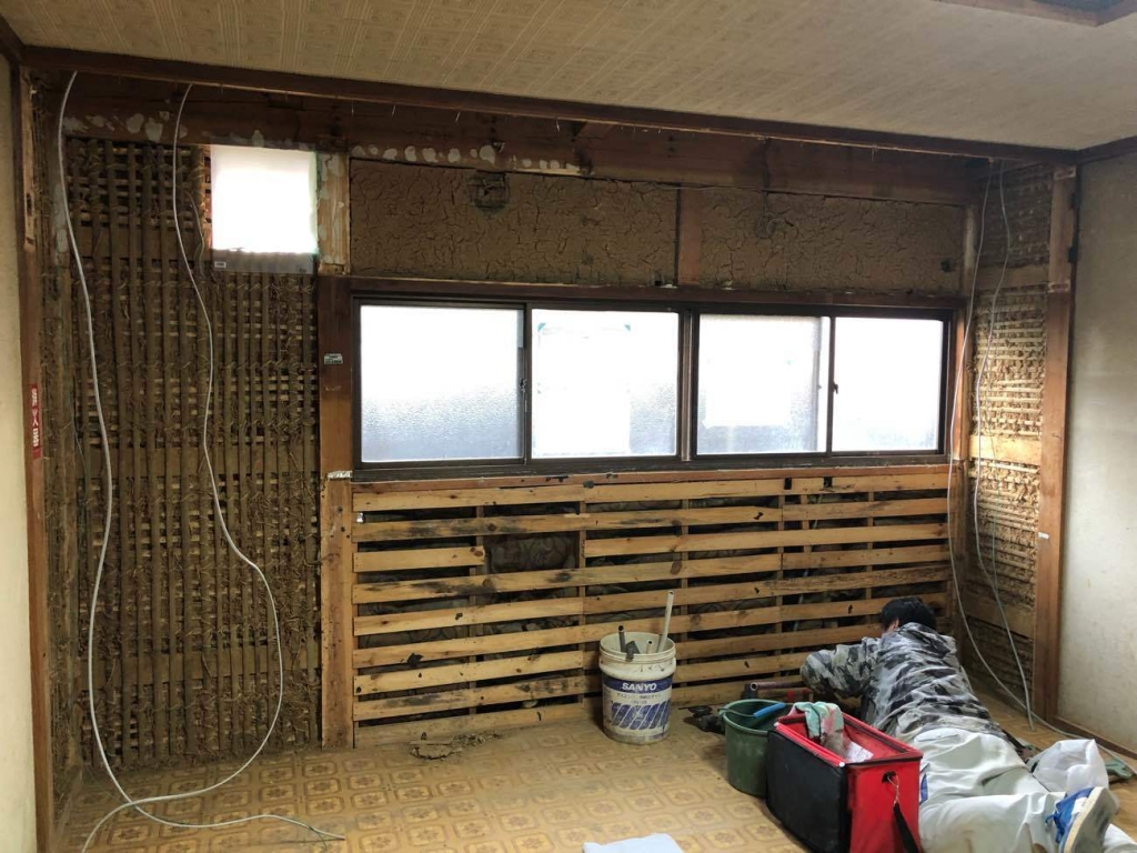既存の流し台設置個所は木下地まで撤去して床と壁の直角を出します