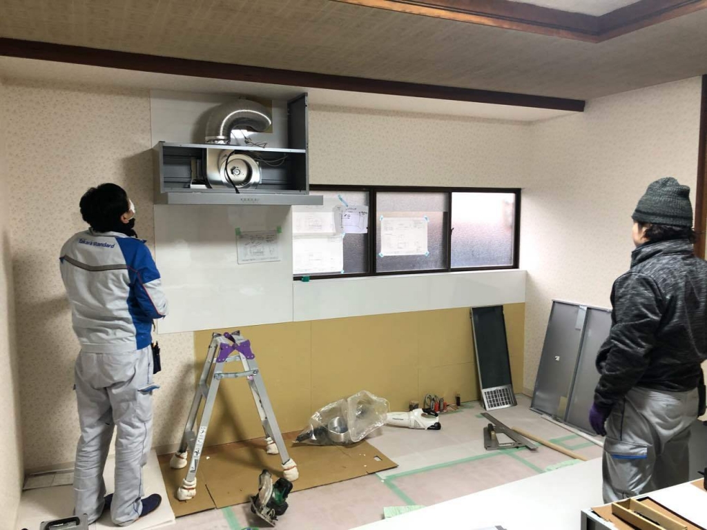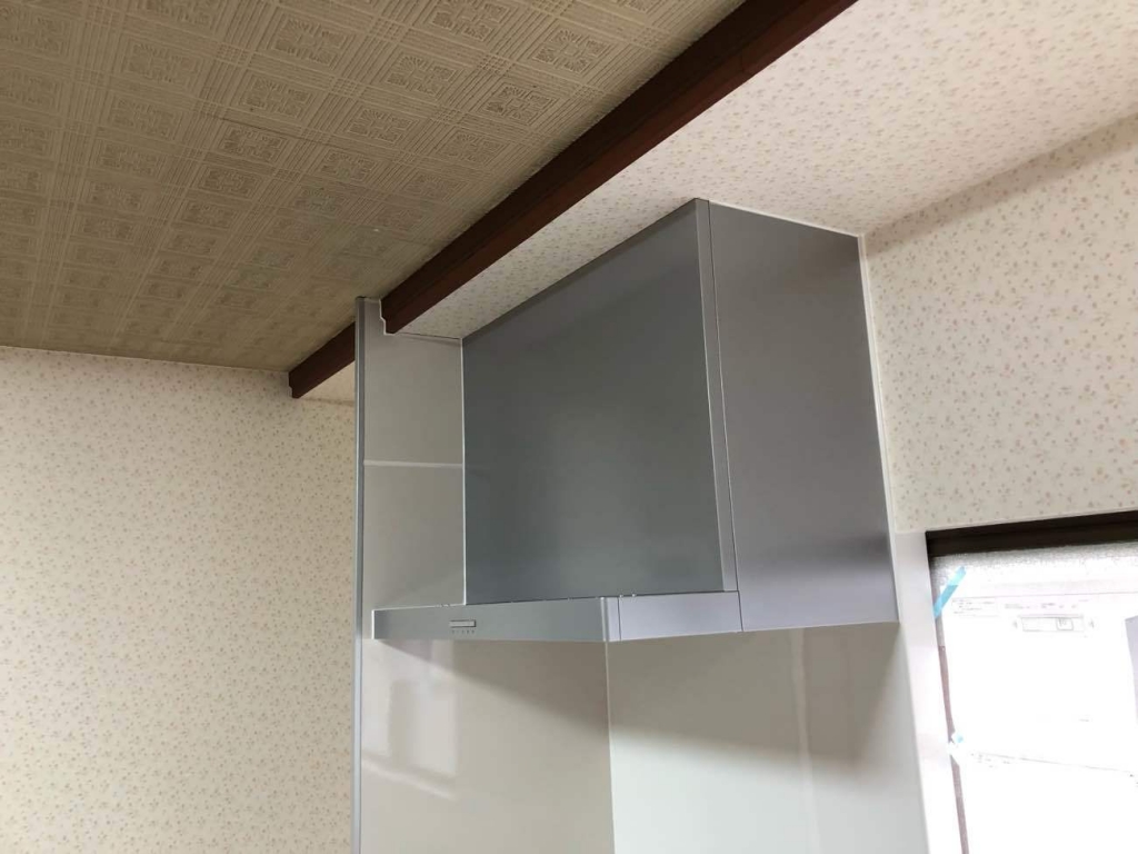 システムキッチン設置⇒最初にレンジフードから施工いたします