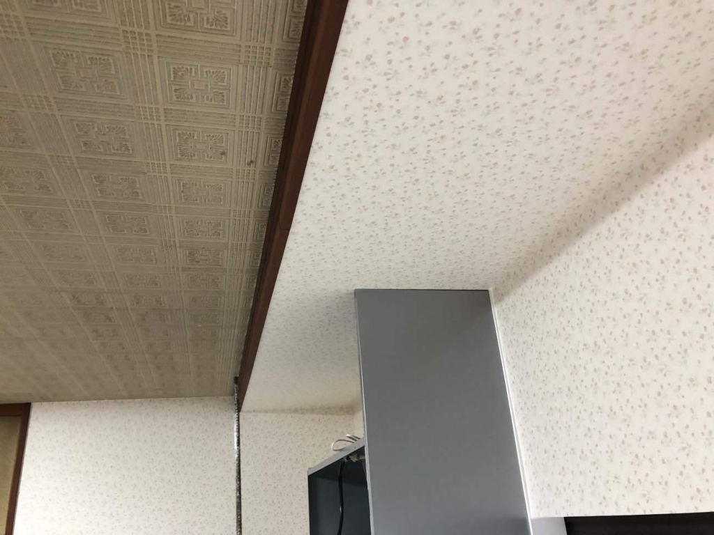 既存と新設部の天井の段差と仕切りとなるエンドパネルの取り合い部を⇒