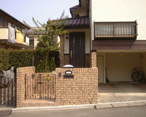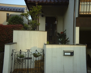 塀を一部切り取り、通りからの死角を軽減。採光・通風も良くなりました。 塀・床と明るいタイル貼りで統一し、玄関扉と腰壁の タイルが引き締めています。 住まいの印象がワンランクアップ。 家主の好きな草花を飾って、来客を迎える準備も整いました。