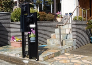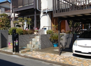 | 【使用材料】 | クウォーツストーン(ウロコパターン) ストーンタイル 機能門柱・カラーモニーター付きインターホン TOTO ガードウォーカー(階段部取付 手すり) |