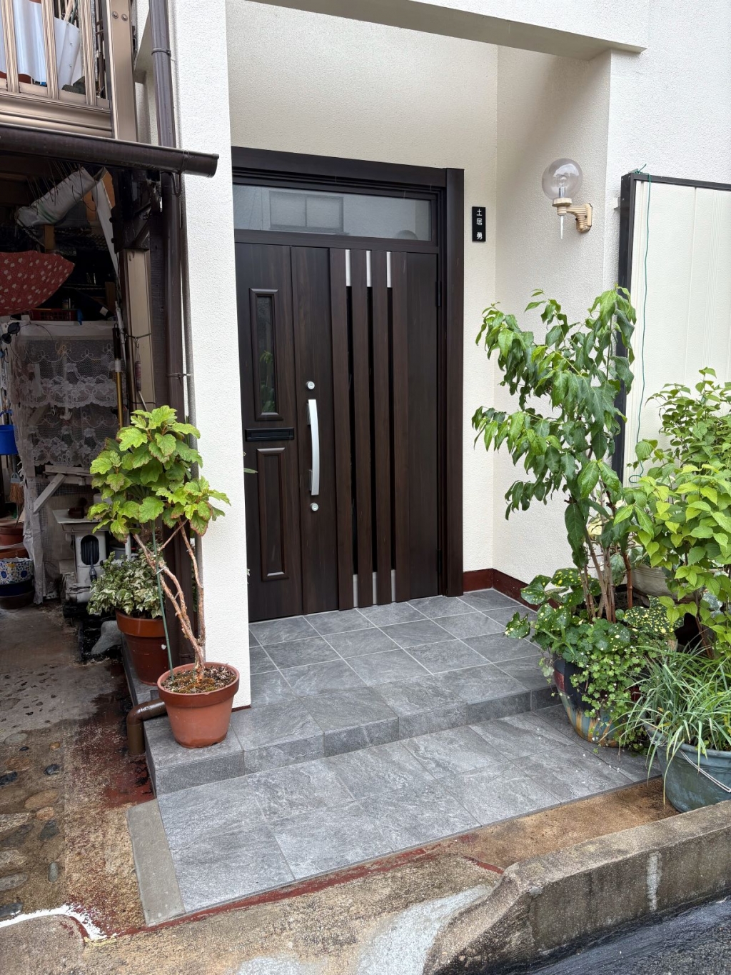 片開きの扉と子扉を組み合わせたタイプ。子扉は必要に応じて開けることができ、大きな荷物を運び込むときなどに便利です。玄関タイルも新調しました。