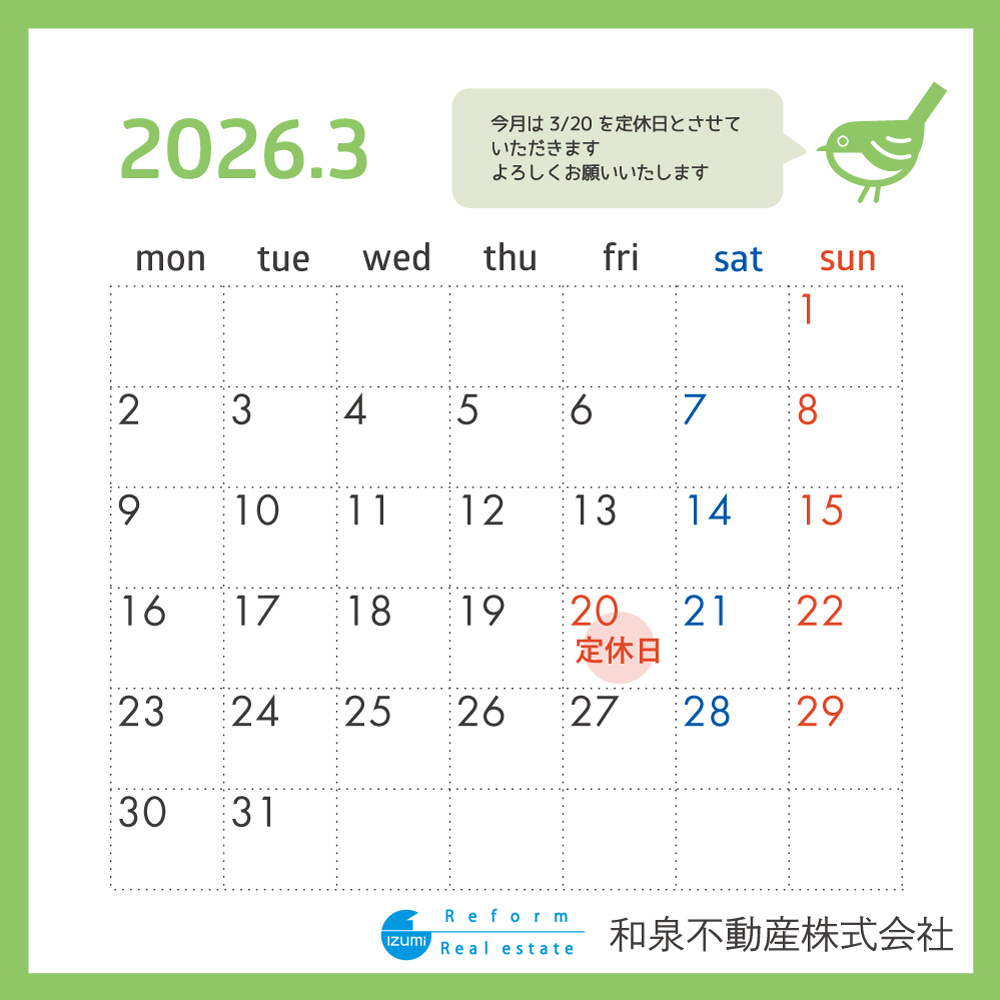 3月は20日(金)を定休日とさせていただきます。