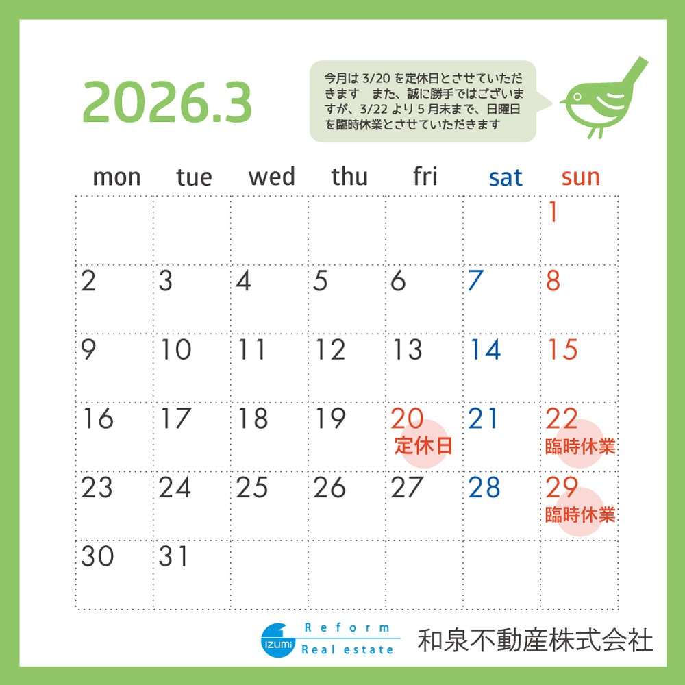 日頃よりたくさんのご愛顧を賜り、誠にありがとうございます。 3月は20日(金)を定休日とさせていただきます。 また、誠に勝手ではございますが22日より、5月末までの間 日曜日を臨時休業とさせていただきます。 お客様にはご迷惑をおかけいたしますが、 ご理解のほどよろしくお願い申し上げます。
