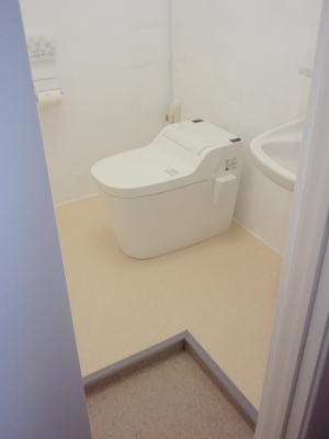 通常のトイレ取替え工事と違い下水道配管工事、給水配管工事、床のコンクリート工事(段差仕上げ)も行う為とても大がかりな工事となりますが以前の和式トイレより明るく、綺麗なトイレへ変わりました。