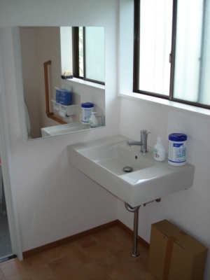 | 【使用材料】 | ユニットバス:パナソニック SocieV Eタイプ1616サイズ トイレ:アラウーノS 洗面化粧台:INAX サティス洗面器 GS-A558SB |