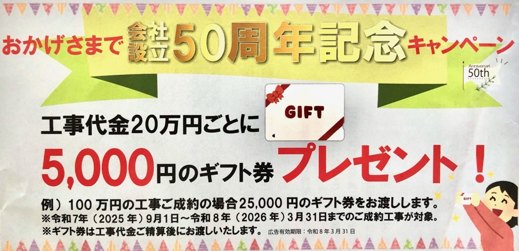 皆様のおかげで弊社は2025年9月に設立50周年を迎えました。 それに際しまして、記念キャンペーンを2026年3月末まで実施しております。 対象工事はリフォーム全般です(新築工事は対象外です) 今後ともどうぞよろしくお願いいたします。