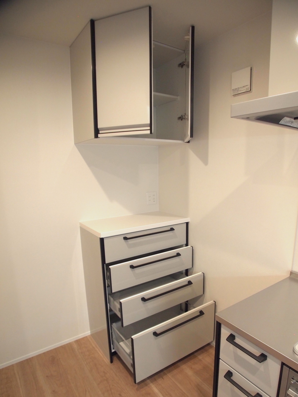 冷蔵庫横に収納力の高い食器棚も設置しました