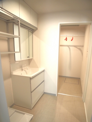1階浴室横の洗面化粧室の奥は室内干しが出来る、浴室換気乾燥暖房機が付いた部屋となっており、天井吊りタイプの物干しも完備しております 洗濯パンの上には吊り下げ棚も設置