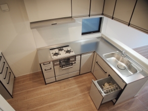 2階キッチンはグリル付きガスコンロ3口と食器洗浄機を完備 収納戸棚も豊富