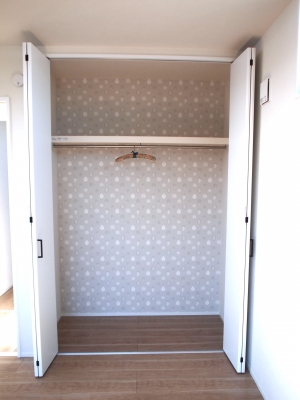 クローゼットの壁紙はアクセントとして遊び心ある模様を使用
