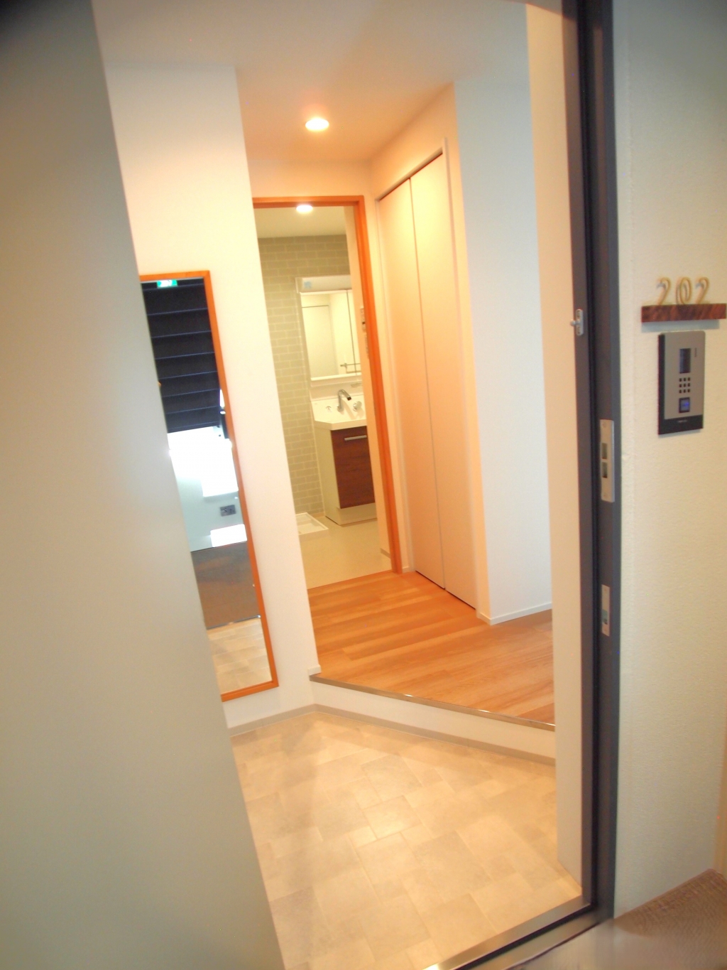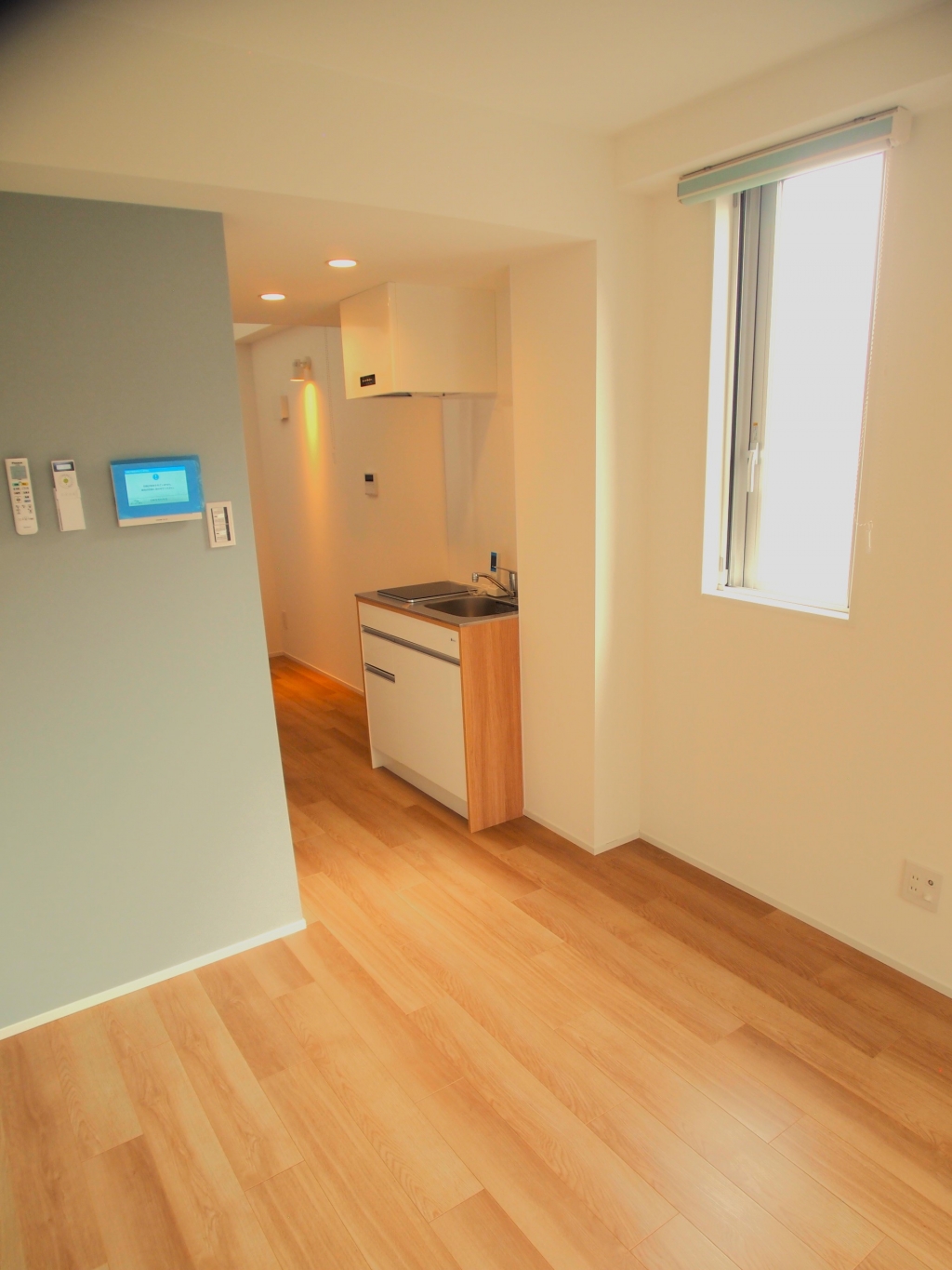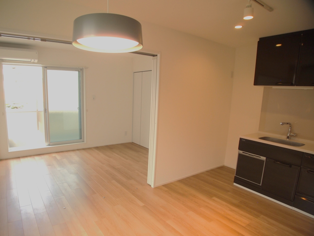 202号室のリビングダイニングキッチン 奥の部屋には大きなクローゼットがあります キッチンは食器洗浄乾燥機付き