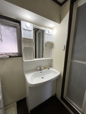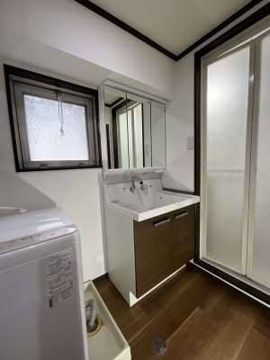 洗面化粧台取替工事 1面鏡、2ハンドル水栓から 収納3面鏡、シングルレバーシャワー水栓に取替 床クッションシート、壁クロス張り替えました。 工期2日