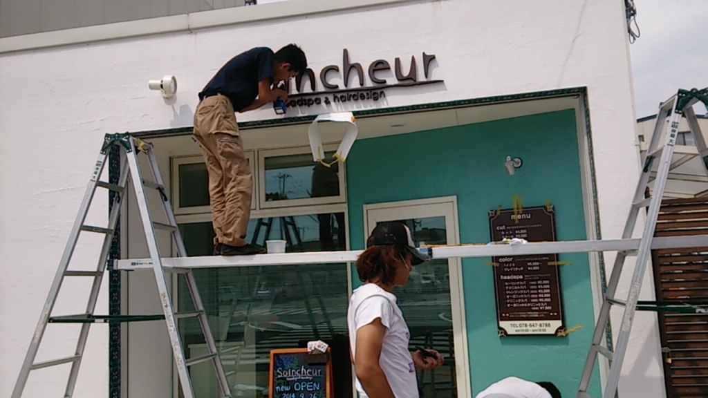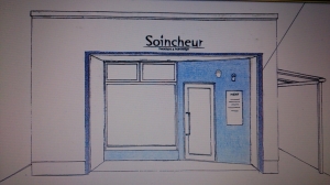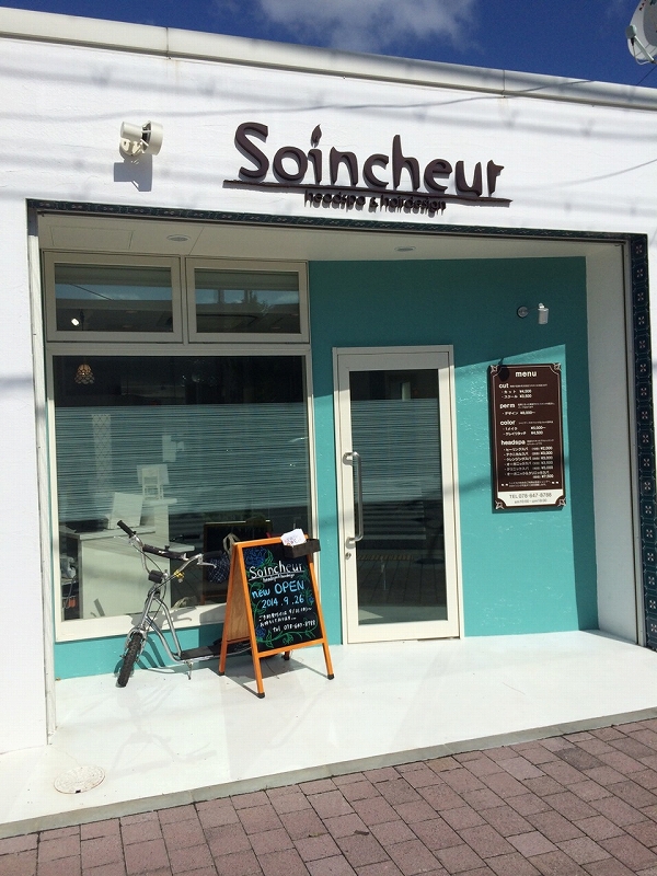 外部にはワンポイントの青系タイルとメニュー看板の下地の壁はグリーンの塗装、そして茶系のSoincheurのロゴ看板で浮きだした文字でシンプルに仕上げました。