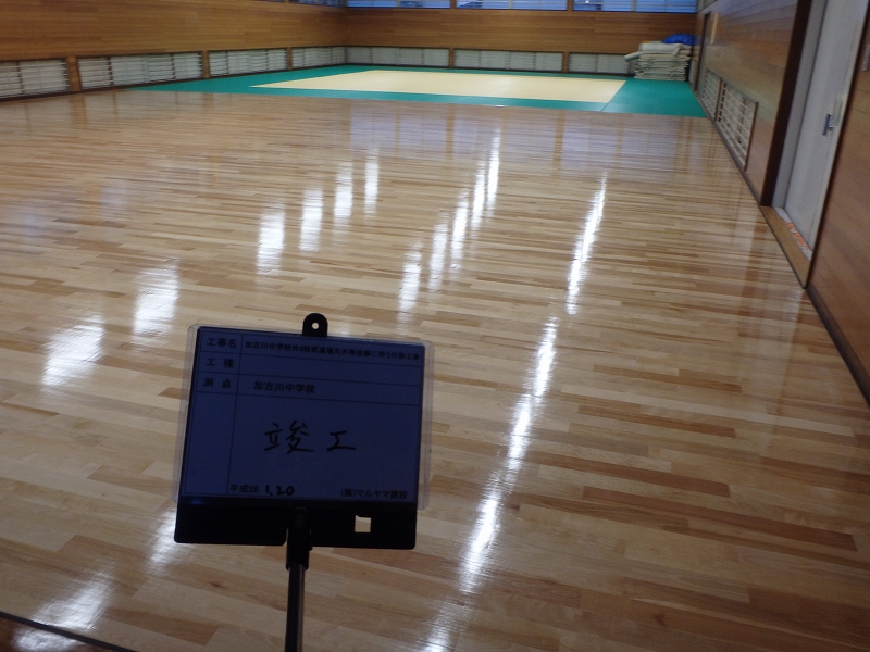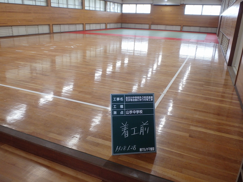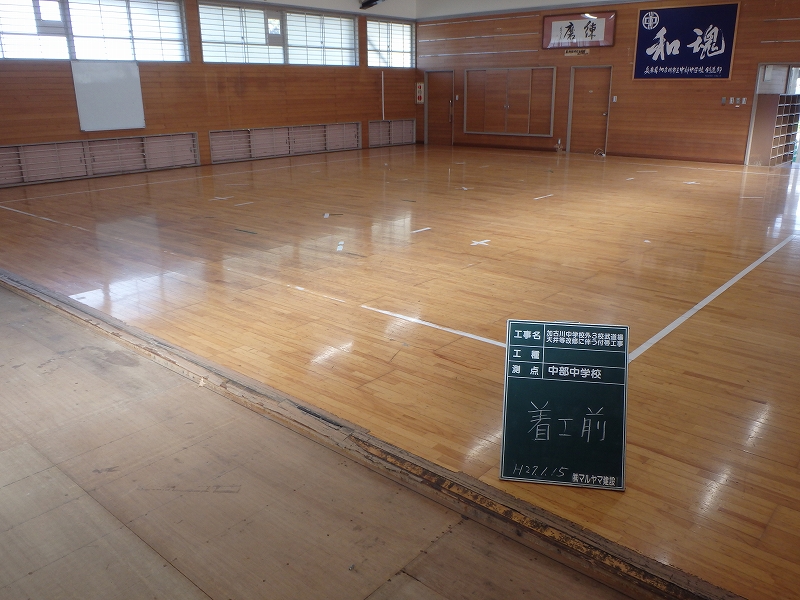 加古川中学校、山手中学校、綾南中学校、中部中学校の床張替え 学校指定の素材となると一般に使われる素材と違い特別に衝撃性に優れたもの・耐摩耗に優れたものなどを使います。 そういった特別な素材を扱うに足る技術を持って施工しており、 安全面に対しても学校側・生徒達に配慮して安全かつ適切な期間をもって工事をし施工完了しております。