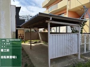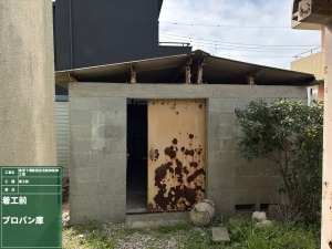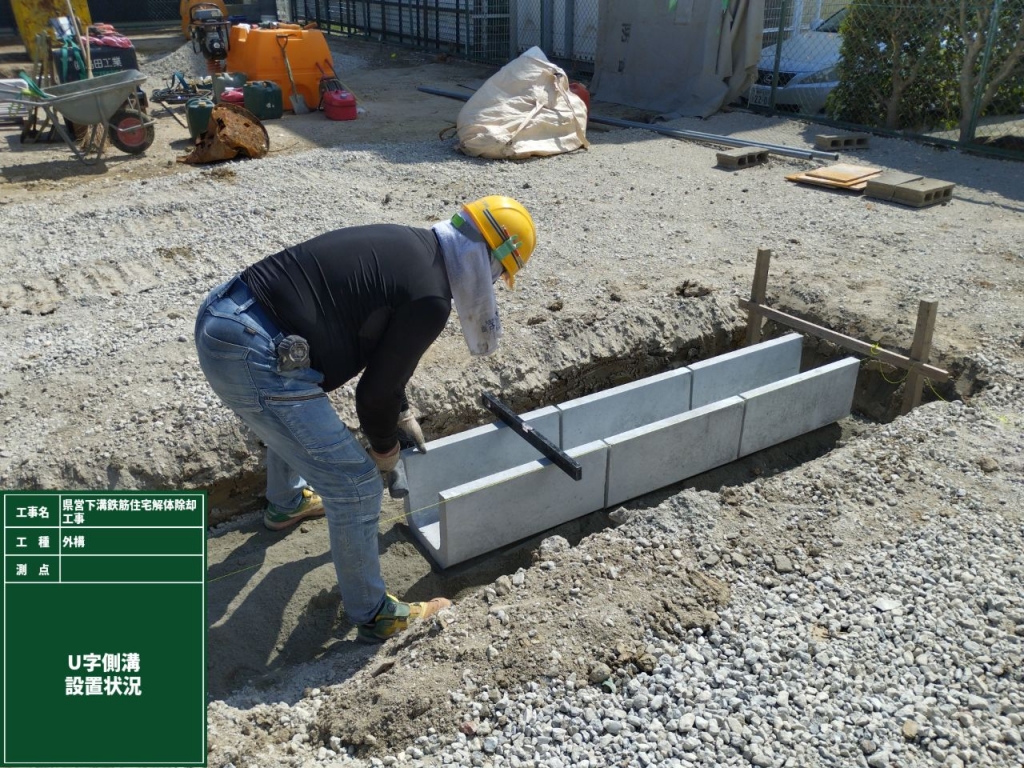 自転車置き場、プロパン庫、ポンプ室解体から、内装解体、機械設備の撤去撤去を行い、建物を解体したのち、U字側溝・フェンスを設置し、砕石舗装で仕上げを行いました。