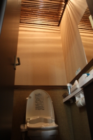 演出のトイレスペース。限られた空間をより広く感じていただくために、和を用い、光を活用してイチ癒し空間に仕上げました。