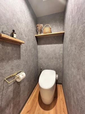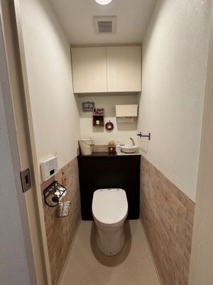 | 【使用材料】 | トイレ本体:TOTOネオレストRS1 クロス床材全面貼替 ペーパーホルダー、棚などアクセサリ取付 |