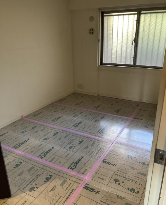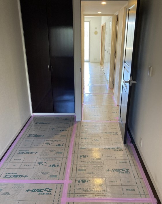 今回は床の貼り替えを行わないため、まずは「守る」作業から。 既存の床を傷めないよう、専用の養生材(エコフルガード)で隅々まで丁寧に保護してから作業を開始。