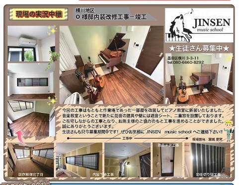 今回の工事はもともと作業場であった一部屋を改装してピアノ教室に新装いたしました。