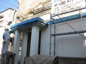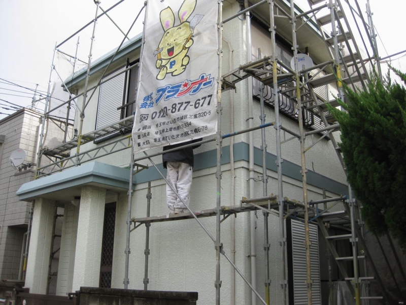 【工事中①】しっかりと足場を組み、塗装の準備を進めてゆきます。