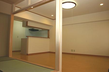 和室とリビングの間仕切り壁を撤去して、新しい和室兼茶室を実現。白木に合わせて、リビングのフローリングやクロスを明るい色へ変更しました。