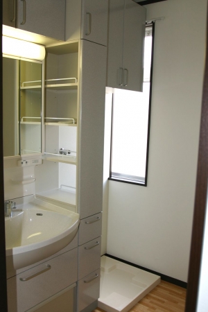 【洗面所】奥に見えるのは昇降式の吊戸棚。収納力が格段にアップしました。