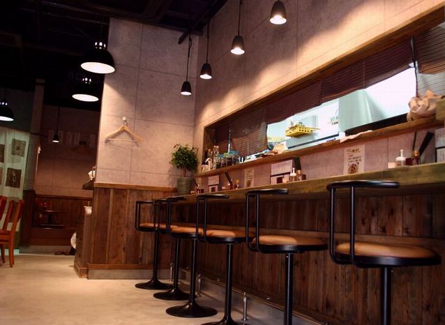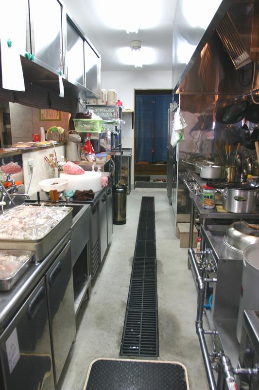 客席・厨房とも床材はコンクリートの金コテ仕上げ。油や汁をこぼしてもお店中を水洗いできるので掃除の手間も少なくて済みます。