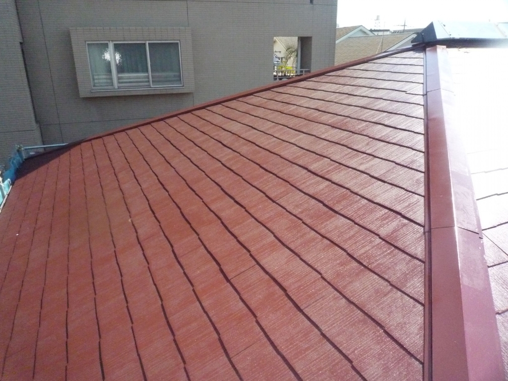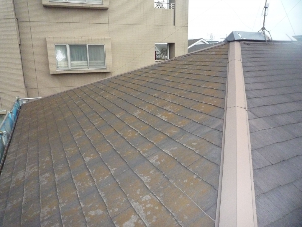 経年劣化により、カビや苔が目立ち始めた屋根。お住まいの改修工事と併せて屋根塗装工事を行わせていただきました。明るい色をお選びいただいたため、建物の印象も爽やかになりました。シリコン塗料でお住まいをしっかりと守ります。