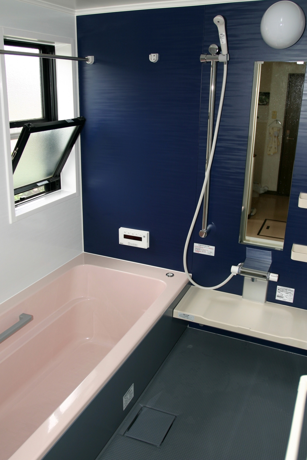 今回のユニットバスはイメージを変え大胆な色使いの物をご希望でしたので、インパクトがありつつ落ち着きのあるプランで施工させて頂きました。