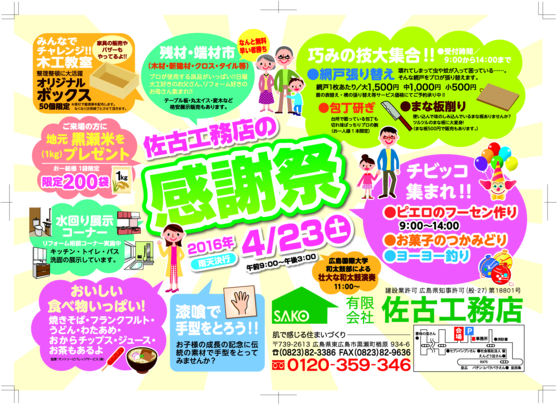 平成28年4月23日土曜日 佐古工務店作業場にて第11回感謝祭を開催致します。 今年は広島国際大学和太鼓部による演奏や大工さんと作る「オリジナルボックス」・ピエロの風船作りなど、さまざまなイベントをご用意しております。 スタッフ一同皆さまのご来場をお待ちしております。