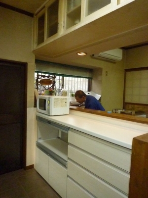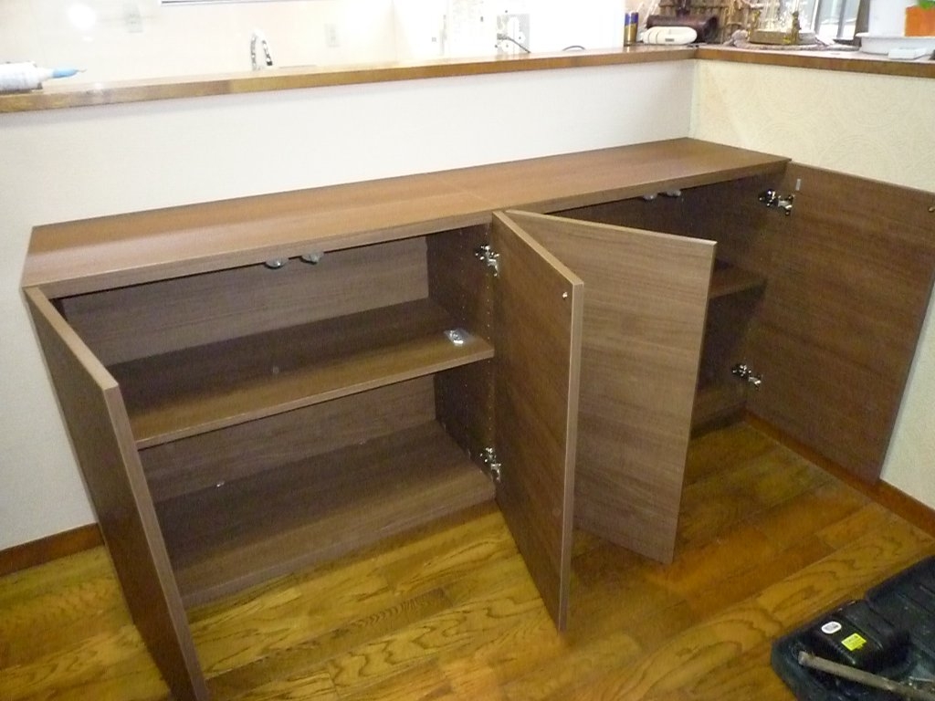 背面は腰壁と吊戸をそのまま利用して、下台を家電収納へ変更。